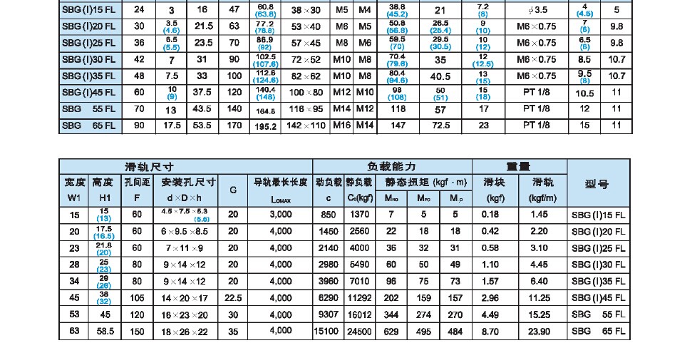 韩国SBC直线导轨 SBG25FL SBG30FL SBG15SL SBG20SL SBC 直线导轨系统特性 1.价格低廉 SBC 直线导轨在各个方面都非常经济特别在设计简单,高结构强度和产品本地化等方面尤为突出. 2.交货迅捷 所有标准型号全部现货供应。 3.精确的位置精度 由於动,静磨擦之间的微小差异,SBC导轨使磨擦系 数降到1/50。因此可以响应微量位移,实现精确定位。 4.节约生产成本和电力损耗 由於SBC导轨磨擦系数小,可使驱动装置小型化,并可提供高速运动。因此采用SBC导轨可生产出高性能机械同时减小电力损耗。