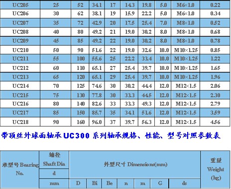 虽然它的基本性能与深沟球轴承应是相似的,但是由于这种轴承大都应用在比较粗糙的机械中,安装定位不够精确,轴与座孔的轴线对中性差,或是轴长而挠度大等的情况下,而且轴承本身精度也不够高,有的结构也较粗糙,因此共性能的实际表现比较相同规格的深沟球轴承要打上相当的折扣。例如带顶丝的外球面球轴承应用于刚度差挠度大的通轴,这种轴承两面带密封圈,能严密防止污物侵入,出厂时巳装填适量的润滑剂,安装前不需清洗,不需补加润滑剂,轴承内圈凸出端上的顶丝螺钉在轴上紧固时.允许的轴向负荷不得超过额定动负荷的20%。