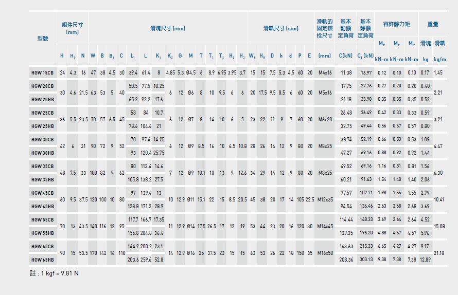 设备详细描述(台湾HIWIN滚珠导轨HGW-CB系列): |