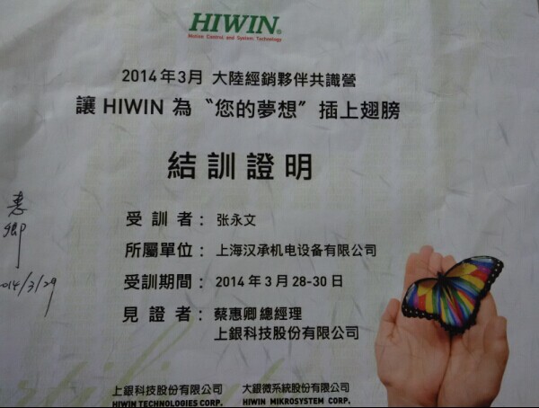 汉承设备网 汉承设备网 >> 汉承公司资质 >> 代理证书 >> 台湾HIWIN代理经销资质 设备网